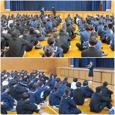 2学期まとめ、各学級の振り返りから進路実現に向けてまで、多岐にわたる話を聞きました。体育館に全員集まって話を聞いている後ろ姿を見ていると、この3年間、大きな成長を感じます。