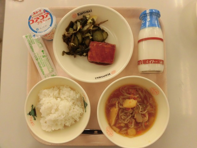 今日は、海藻サラダでした。海藻サラダに含まれているわかめは、カルシウムやカリウム、鉄などのミネラルが豊富です。「めかぶ」という食材を聞いたことがあるでしょうか。「めかぶ」とはわかめの根もと部分のことをいい、めかぶにも栄養がたっぷり含まれています。