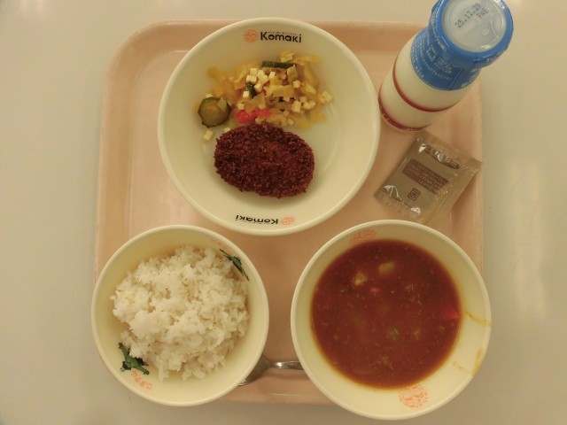 今日は、カレーライスでした。今日のカレーは、牛ひき肉が使用されていました。牛のうまみがしっかり出ていて、使用する肉が異なると味わいも変わって面白いですね。