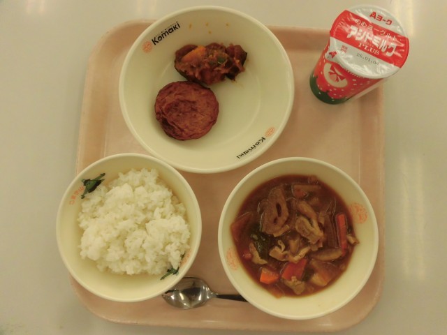 今日の給食には「かぼちゃのいとこ煮」が提供されました。野菜と豆(小豆)を親戚のように見立てて「いとこ煮」と呼びます。汁物には、「ん」のつく食べ物がたくさん入っていました。