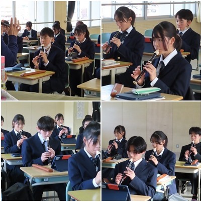 先生のリズム・指使いに合わせて 笛を吹く (1年 音楽)