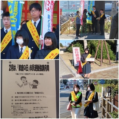 毎月第3日曜日は家庭の日 そして2月は「家庭の日」市民運動強調月間です。そのチラシなどを配付しました。屋外での活動でしたが、天気も協力してくれ、暖かい日差しの中で生徒の活動を見ていると温かい気持ちになりました。