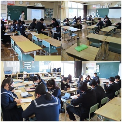 進路先への一般の入試日です。登校している生徒がまとまって学習に取り組んでいます。