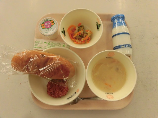全国学校給食週間最終日の今日は、愛知の米粉を使った米粉パンや、愛知県産のれんこん、ブロッコリーを使ったれんこんサンドフライ、ブロッコリーサラダが提供されました。そして、特産品である蒲郡みかんを使った蒲郡みかんゼリーがデザートにつきました。