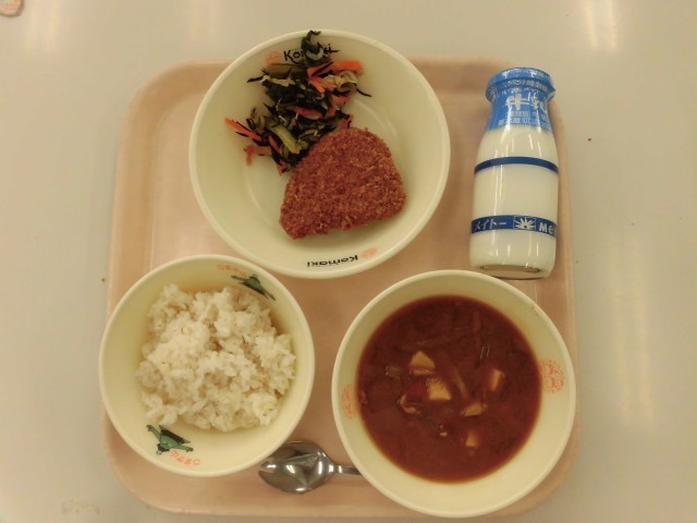 今日は、2年生が家庭科の授業で作成した献立を参考に「具だくさん豚汁」と「野菜とひじきのあえもの」が提供れました。