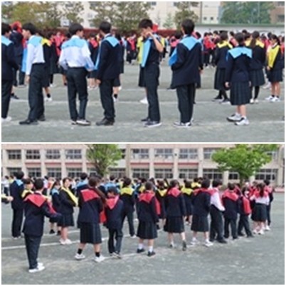 17日(金)本校創立80周年を記念しての人文字を撮影しました。集合写真とそして80の人文字です。地上からの写真だけですが、3色のエプロンをまとっての撮影でした。