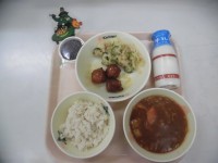 主食はごはんに豚丼の具をのせて食べます。主菜はサーモンフライ、副菜ははくさいのごまあえです。