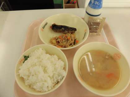 主食はごはん、主菜はいわしの梅煮、副菜は千草あえと麦みそ汁、そしてココア牛乳のもとがつきました。
