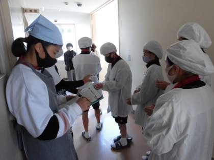 各階の配膳室前では、保健委員を中心にアルコール消毒と給食当番の健康チェックを行っています。感染症予防の観点だけでなく、給食に直接携わる給食当番の衛生チェックを目的に行っています。ひとりひとりの意識がとても大切です。