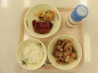 主食は白玉うどんで五目うどん(汁)に入れて食べます。主菜はいかナゲット、副菜は大根とひき肉のとろ〜り煮物です。