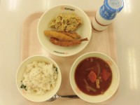 今日はしらす干しが入った炊き込みごはんが登場しました。しらす干し以外にも油揚げ、鶏肉、にんじん、干ししいたけなどが入っています。給食センターの調理員の方によると、つくるのが大変なメニューの一つだそうです。釜の中の炊き込みごはんを混ぜる時は、とても大きな力が必要です。2人がかりで一生懸命混ぜます。しらす干しが入っておりカルシウムも豊富です。ぜひ残さず食べてほしいです。