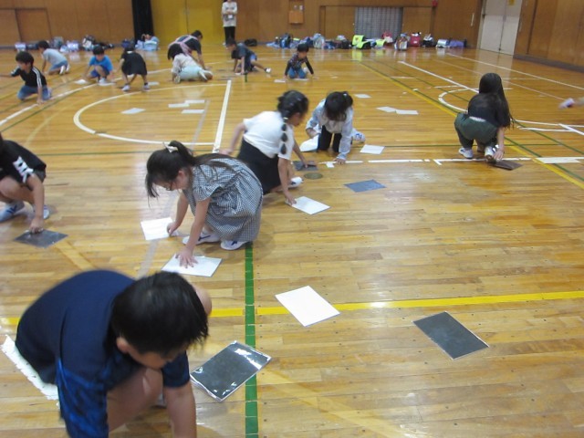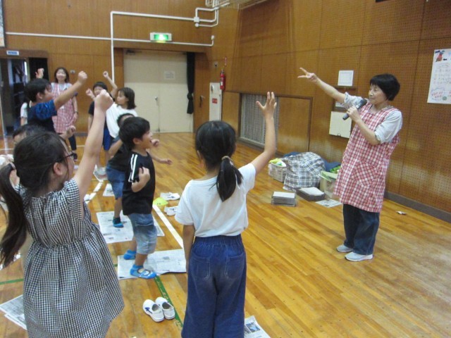 内容は、①足ジャンケン ②新聞紙ジャンケン 新聞紙を一枚ひろげてその上に立ちます。あいこ、負けで新聞紙を折っていきます。だんだん新聞紙が小さくなり立っていられなくなったら終わりです。③きりなしオセロ(パート2)白と黒の2つのチームに分かれ、1分間で自分のチーム色を増やすゲームです。