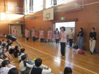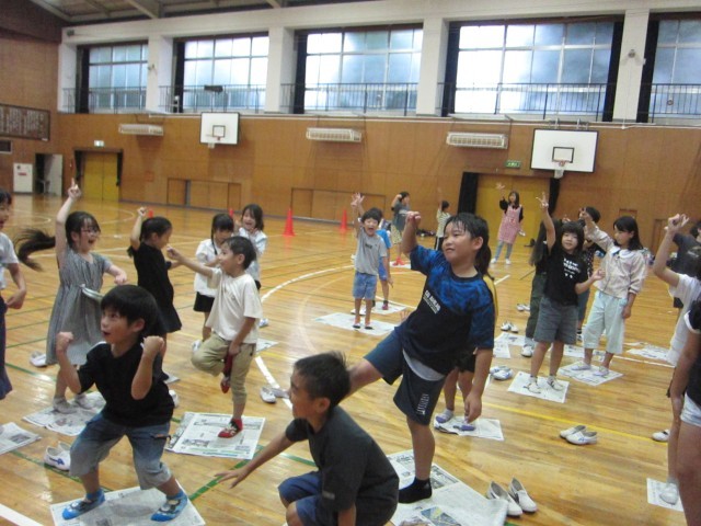 今日は放課後総合プラン。児童クラブとのコラボで2回目。毎年大好評の講座を体育館で「忍者ランドと体遊び」を行いました。講師は、はらっこの指導員の松浦さんです。児童62名、指導員14名。保護者ボランティア4名、ボランティア2名で参加して、大変盛り上がりました。最初は、体遊びです。