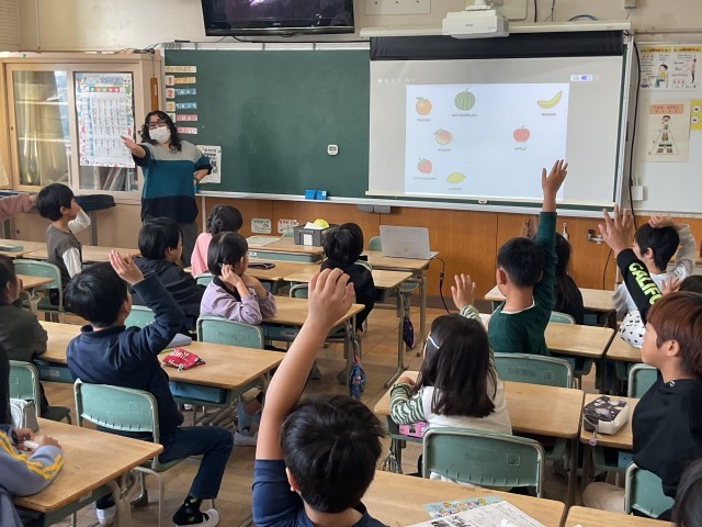 今日の外国語活動では、色や果物の名前を