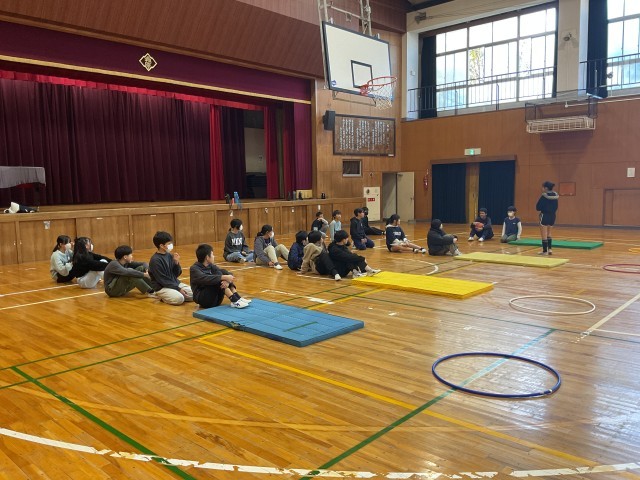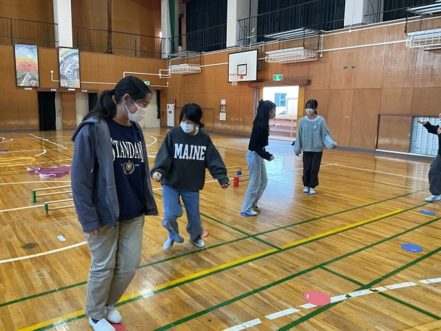 マットの上で前転をしたり、バスケットボールをドリブルしたり、ハイタッチをしたりして仲間と関わり合いながら楽しむ姿が見られました。