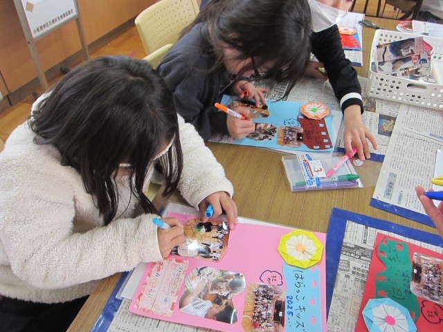 今日の活動は、「スクラップブッキング①」 A4サイズの色画用紙に写真をはり、絵を描いたり、シールをはったりと世界で1つの作品を作りました。今日は表側を作り、2月5日は残りの裏側を作成します。出来上がりが楽しみです。次回は、小牧児童館コラボ②で、防災講座。防災女子リーダー会の方々と小牧児童館の先生と一緒に活動します。図書室です。お楽しみに。