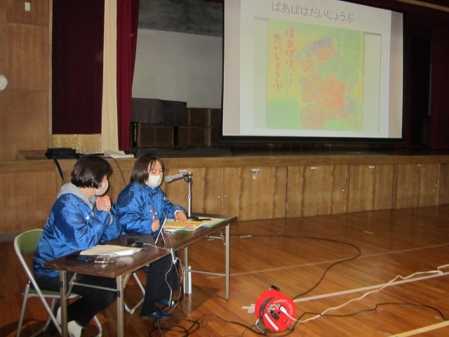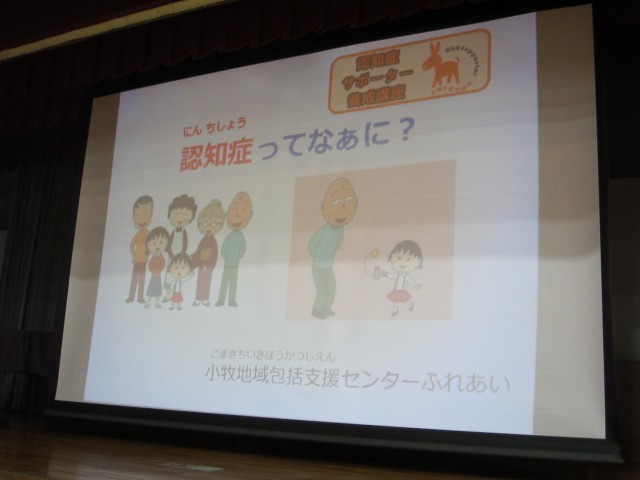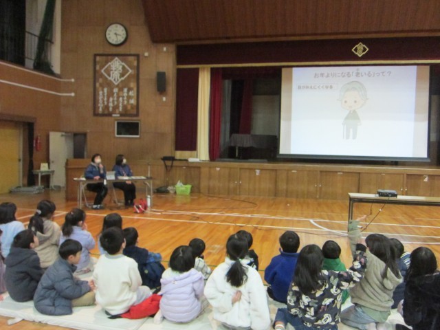 雪がちらちらふってきました。本日は、体育館で第4回放課後総合プランを行いました。活動内容は、認知症キッズサポーター講座です。講師は小牧地域包括支援センターふれあいのお2人です。今回は児童クラブの児童(1~2年生)46名、はらっこキッズ2名が参加しました。まず最初に冊子を使って「認知症とは何か?」を学びました。高齢の方のもの忘れについてくわしく教えてもらいました。