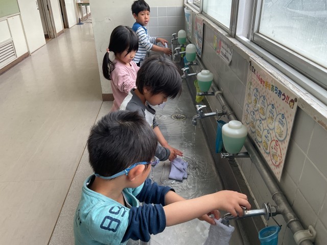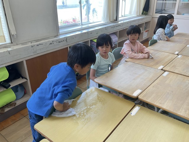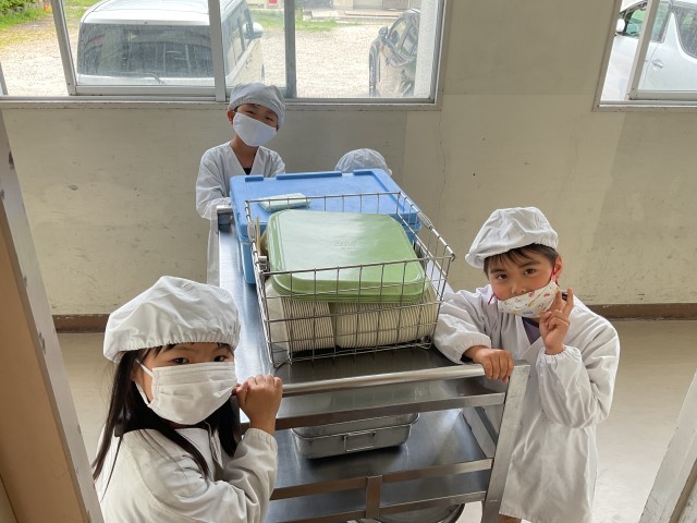 みんなの机をていねいに水拭きする子や給食エプロンに着替えてワゴンを運ぶ子。一生懸命な姿がありました。