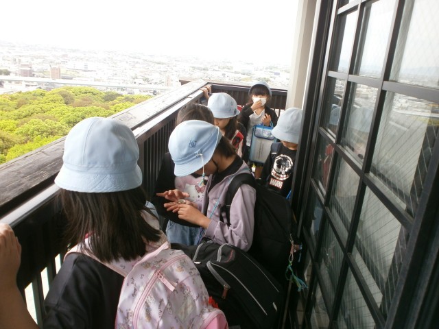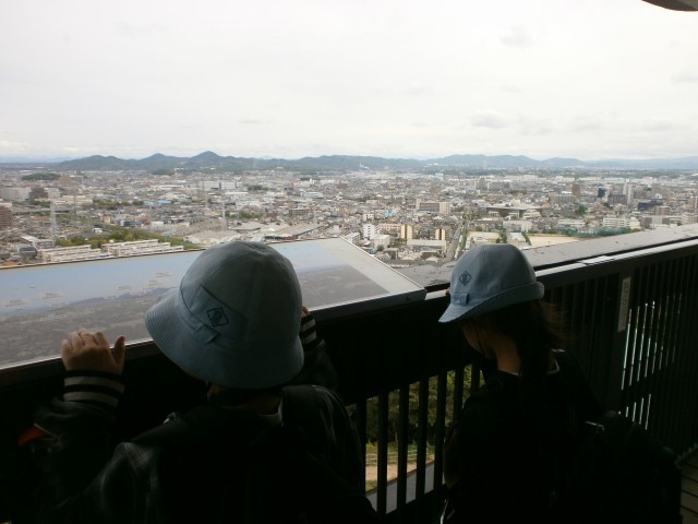 小牧山歴史館の天守に登って、方位磁針で方角を確かめながらそれぞれの方角に何があるのかを確かめました。