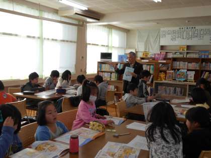 温暖化のしくみや自分たちで防止できることをテキストを使って説明してくださいました。子ども達にテキストの内容をパソコンの映像を見ながら説明してくださったり、温暖化を防ぐ行動をチェック項目にしたビンゴゲームを行ったりしました。