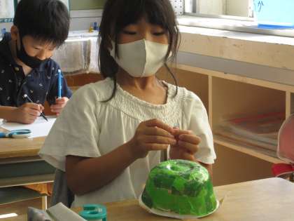 今日は4組の生活で丸い器やかん電池を使って「とことこかめ」を作りました。
