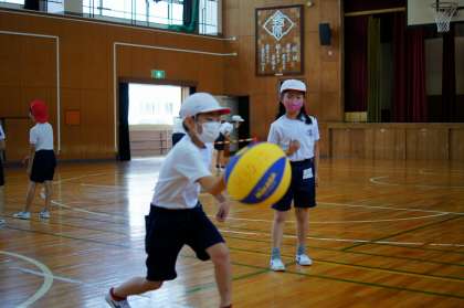 体育ではプレルボールをしています。テニスとバレーボールの組み合わせのようなルールで、チームで協力してがんばっています。