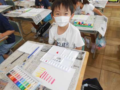 好きな色をつかって線を引いてみたり、にじませたりして絵の具の楽しさを知りました。