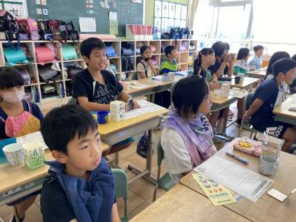 授業の前半では、どうして、虫歯ができるのかやお菓子にどのくらいの砂糖が含まれているのか学びました。