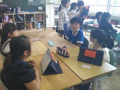 グループで友だちの話を聞き合いました。自分たちの聞き合いのようすを動画に撮って質問の仕方を振り返っています。