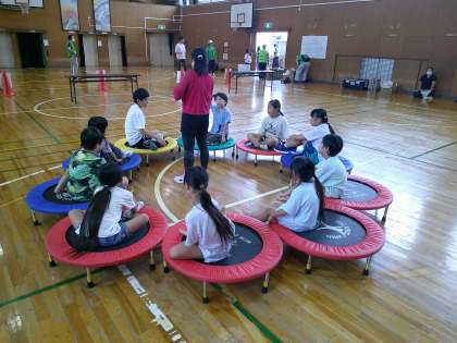 トランポリンの上で跳ねながら、先生や友達と体でじゃんけん