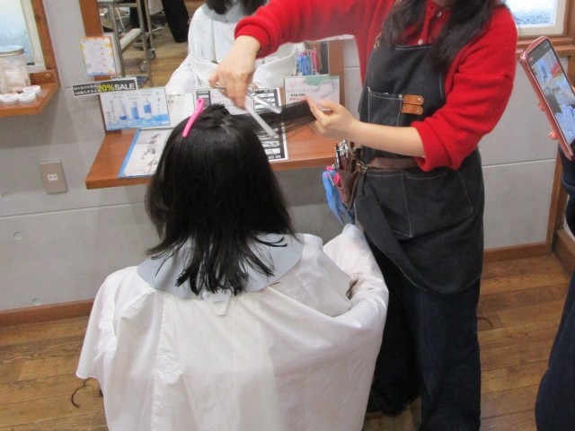 美容室での職業人体験の様子です。パーマのロッドを巻いたり、カットモデルになったりしました。