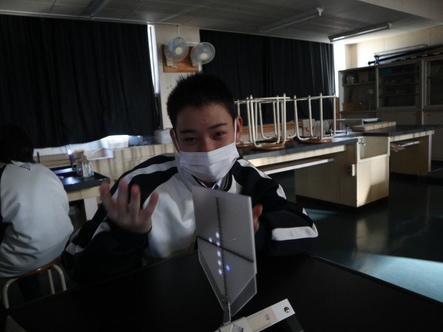 凸レンズを通すと像がスクリーンに逆さに映っていました。理科の実験は不思議がいっぱいですね。