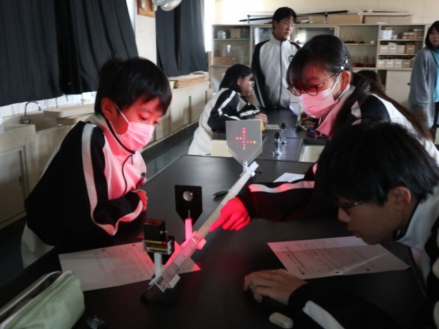 1年生の理科の授業では、凸レンズによってできる像の実験を、光学台という装置を使って行いました。