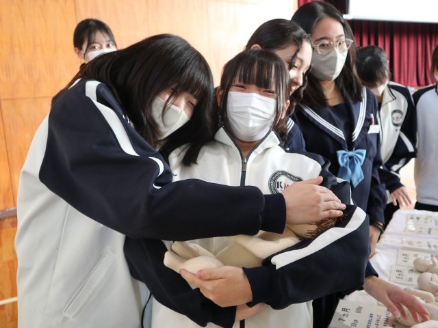 最後に、おなかの中の赤ちゃんと同じ体重の人形で抱っこ体験をしました。みんな大切に抱っこしていました。