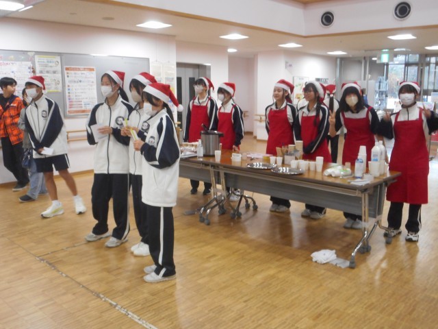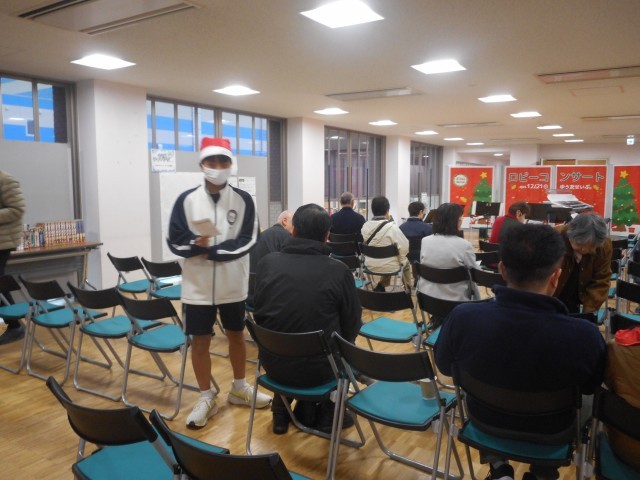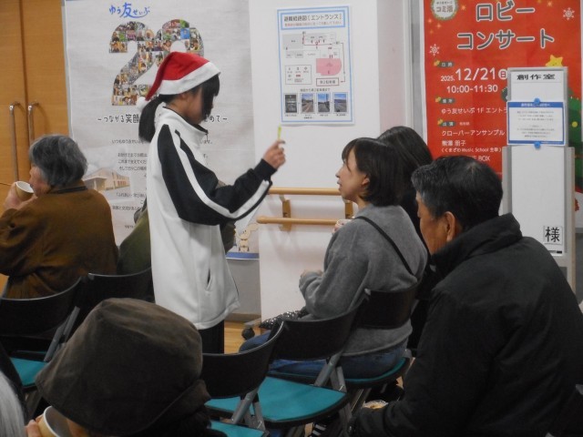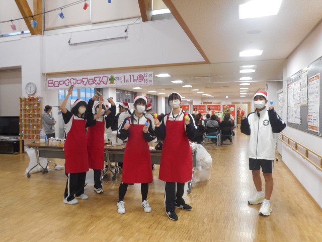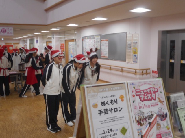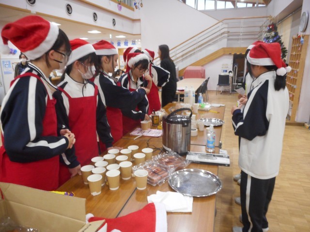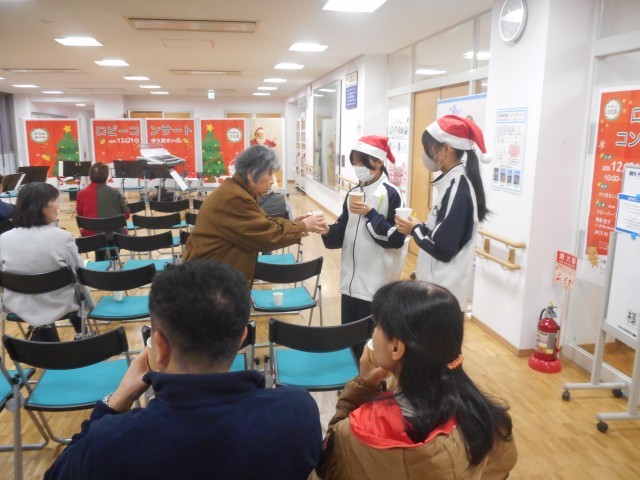 西部コミュニティセンターで『クリスマスロビーコンサート』が開かれ、西中ジュニア奉仕団員たちがカフェコーナーのお手伝いとして参加しました。素敵な演奏が響く会場で、サンタクロースの帽子をかぶり、来場されたお客様に挨拶をしたり、注文を聞いてコーヒーを運んだり、演出の手伝いをしたりしながら、楽しく参加させていただきました。