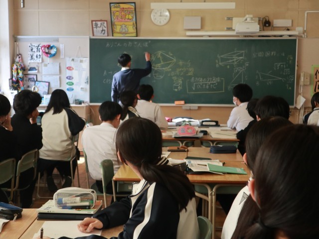 3年生の数学では、問題をグループで話し合い、数名の生徒が前に出て説明していました。