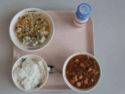 ごはん、マーボー豆腐、野菜しゅうまい、春雨サラダ です。