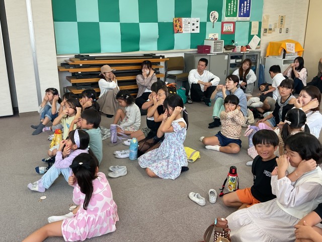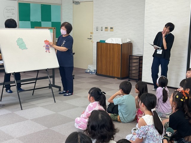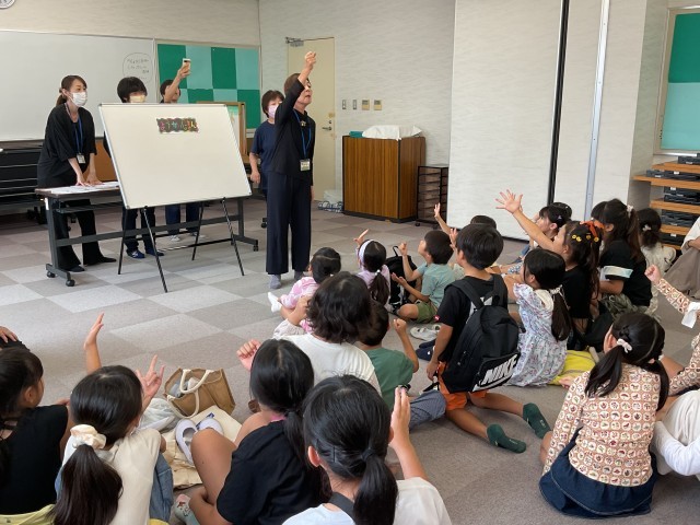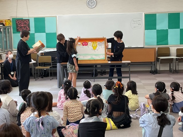 いつも読み聞かせをしてくださっている“びっくりばこさん“による「お話シアター」も開催されました。大型紙芝居「まくらのせんにん」とパネルシアター「ようかいじーまん」の2つのお話を読み聞かせてくださいました。お話の合間には楽しい手遊びもありました。