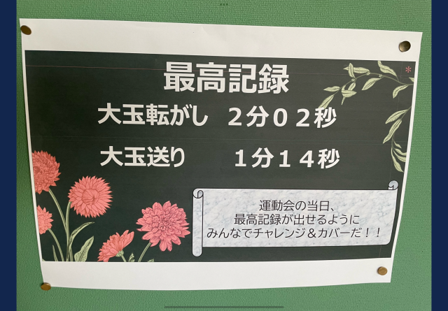 5年生は運動会で「チャレンジMax、カバーでGo!」という競技をします。大玉転がし、大玉送りを本番ギリギリまで練習した結果の最高記録を、運動会本番でみんなで協力(カバー)して、最高記録の更新にチャレンジするというものです。23日(木)に、学年全員集まって作戦会議を開きました。今までよりももっと早くするための良いアイデアをたくさん共有できました。現在の最高記録は、大玉転がし2分2秒、大玉送り1分14秒です。5年生みんなの力を合わせて、最高の運動会にできるようにがんばっていきます。