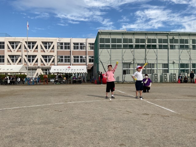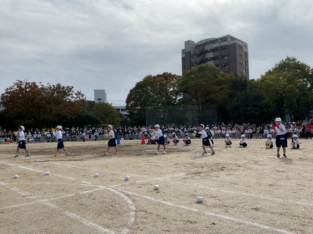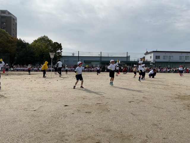 1年生はダンスと玉入れの競遊を行いました。元気いっぱいダンスをして、たくさん玉を入れました
