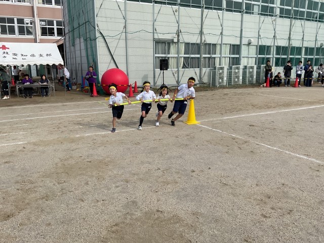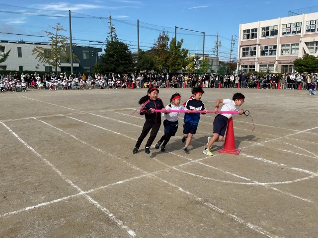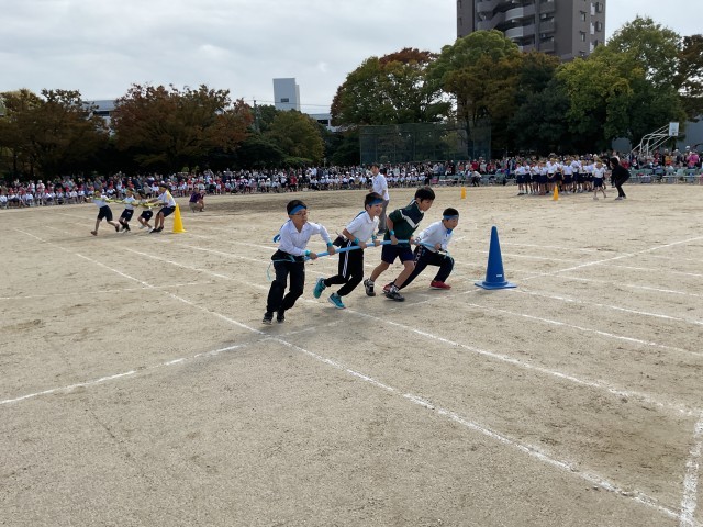 3年生は「台風の目」を行いました。クラスで声をかけ合い、息を合わせて競技に取り組みました。