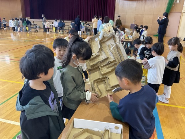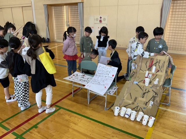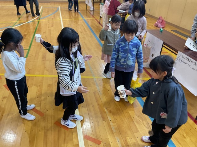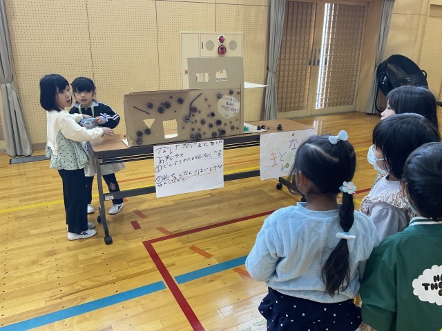 まつぼっくりやどんぐりを使って、おもちゃを作りました。どんぐりのこま回し、まとあて、ボーリング、楽器屋さん、めいろ、けん玉・・・・。楽しいお店ができました。幼稚園、保育園の友達と一緒に「あきまつり」を楽しみました。