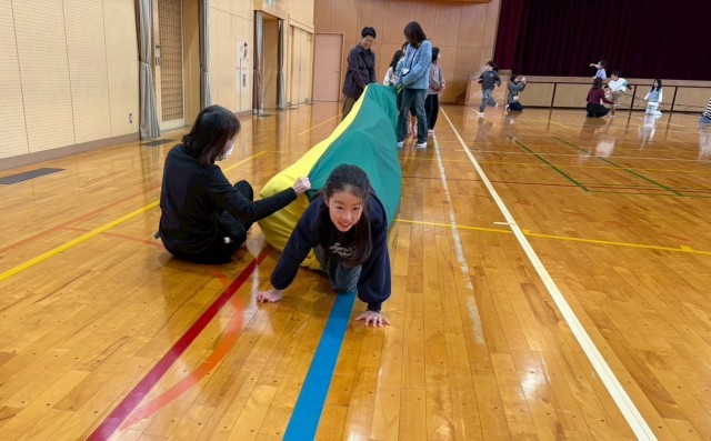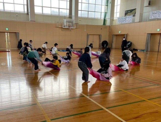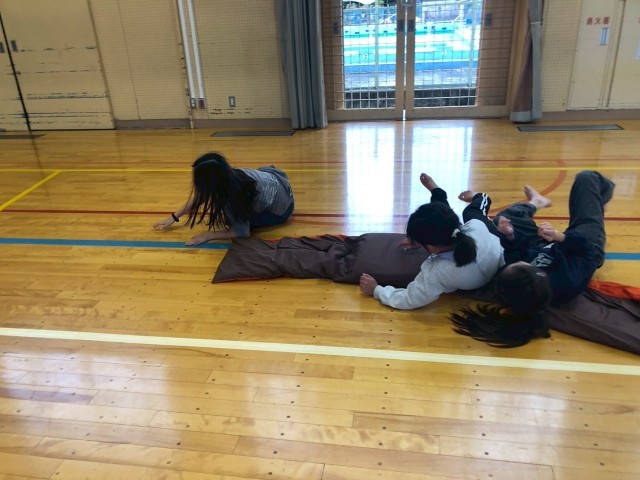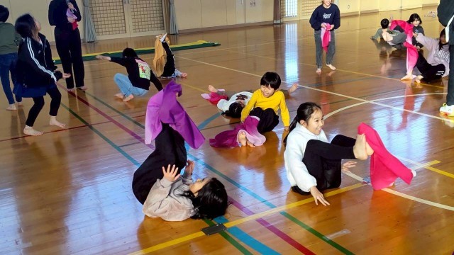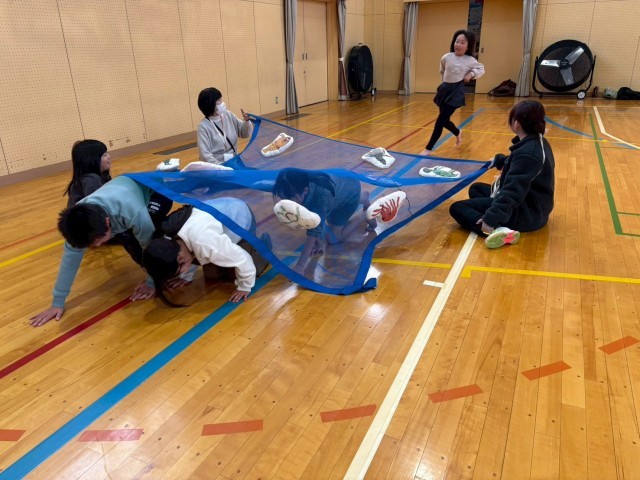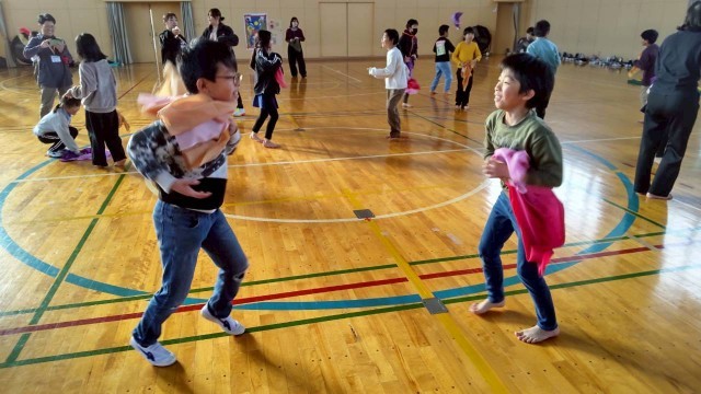 まずは風呂敷を使って忍者になる修行をします。投げたり、受け取ったり、すべったり。