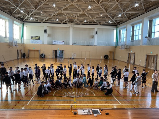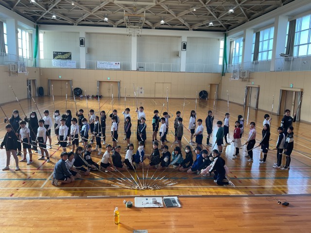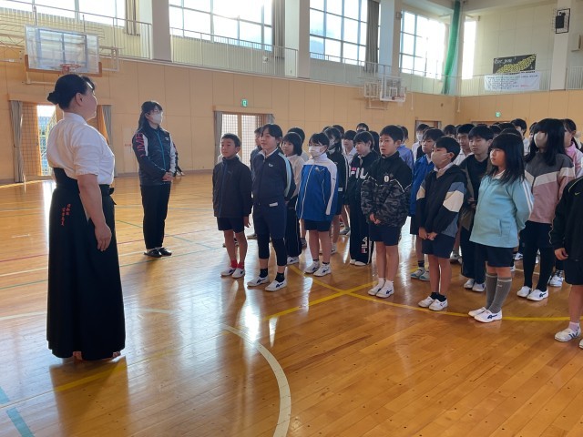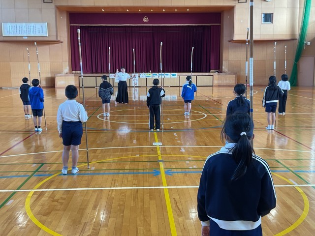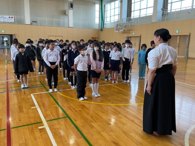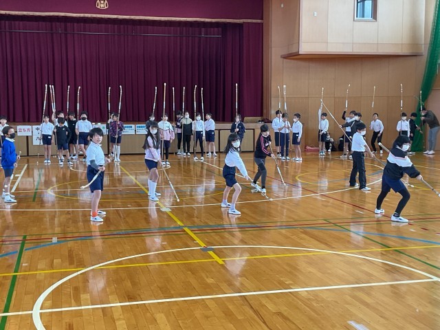 なぎなたの授業の最終日でした。2回の授業で習った構え方や打ち方などを使って、みんなで「打ち返し」をしました。全体練習の後に、列ごとで順番に発表会を行いました。初めてさわった「なぎなた」でしたが、基本的な打ち方の一部を覚えることができました。最後には、講師の先生にお礼の言葉を述べて、集合写真を撮りました。