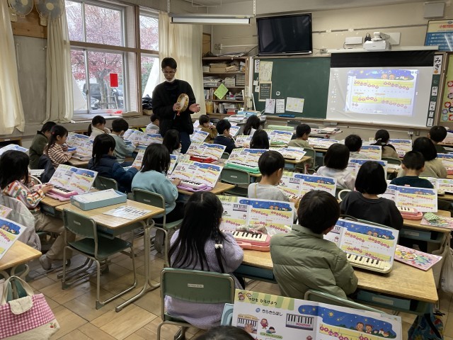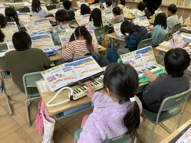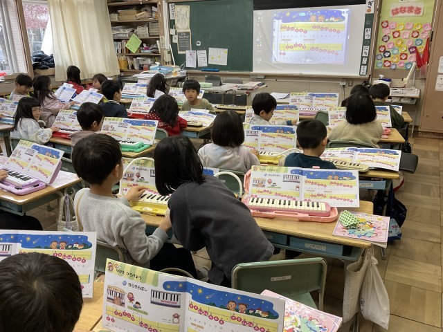 鍵盤ハーモニカで「きらきらぼし」を演奏します。まずはドレミで歌います。そして、指番号、動かし方を確認しました。わからないときは、友だちと一緒に練習します。