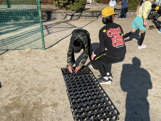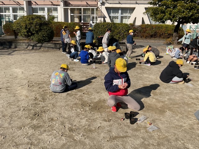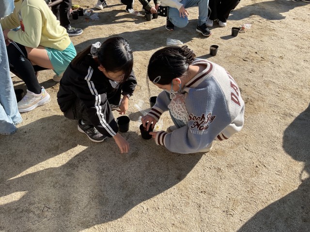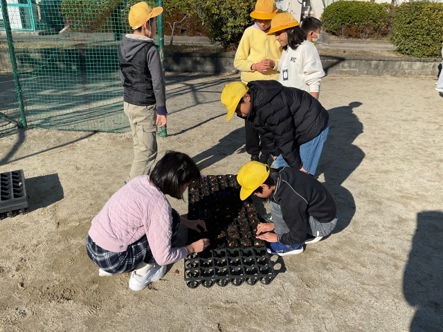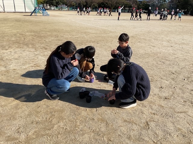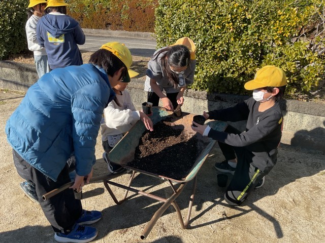 6年生にプレゼントをするためにチューリップの球根を植えました。綺麗な花が咲くように思いを込めて植え替えました。