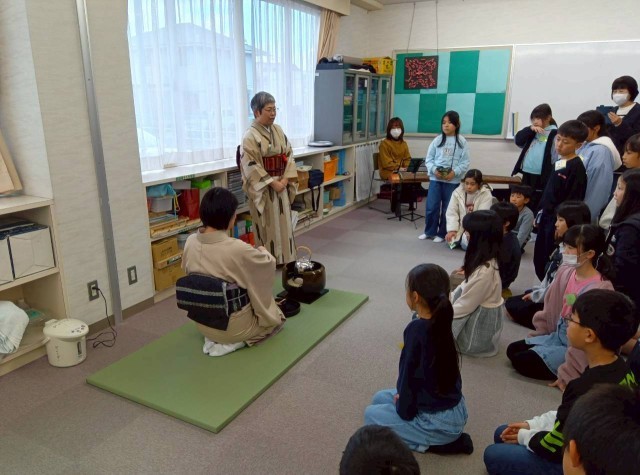 お辞儀の仕方、お菓子の取り方、お茶の飲み方、を教わったあと、お茶の先生のお点前を拝見しました。みんな興味津々。食い入るように見ていました。