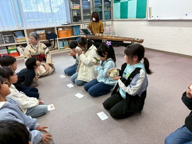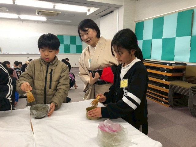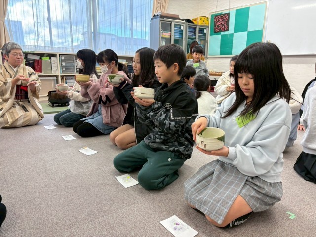 いよいよお菓子を頂き、お茶を点ててペアのお友だちに振る舞いました。一口目「おいしい」、二口目「ちょっと苦い」、三口目「苦ーい」、と言いながら頂いていました。