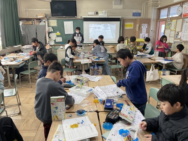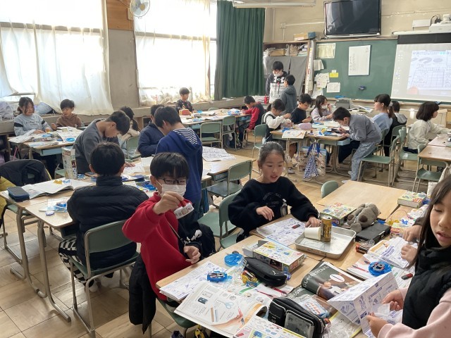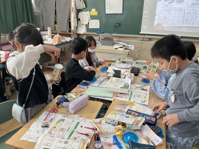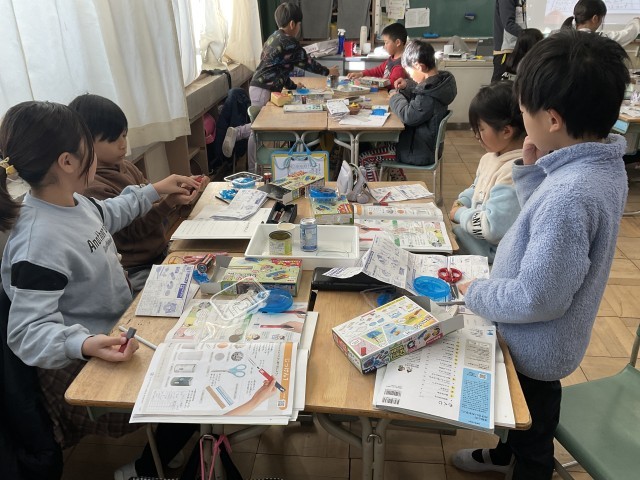いろいろな物に磁石を近づけてみよう。「見て、くっついた」「消しゴムにはくっつかない」つく物とつかない物を調べて、表にまとめました。