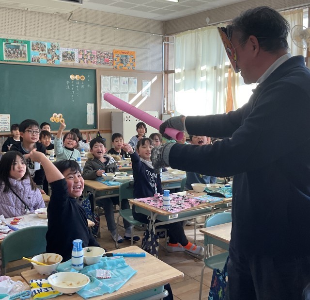 今日は、節分です。米野小学校の1・2年生の教室にも鬼が登場しました。